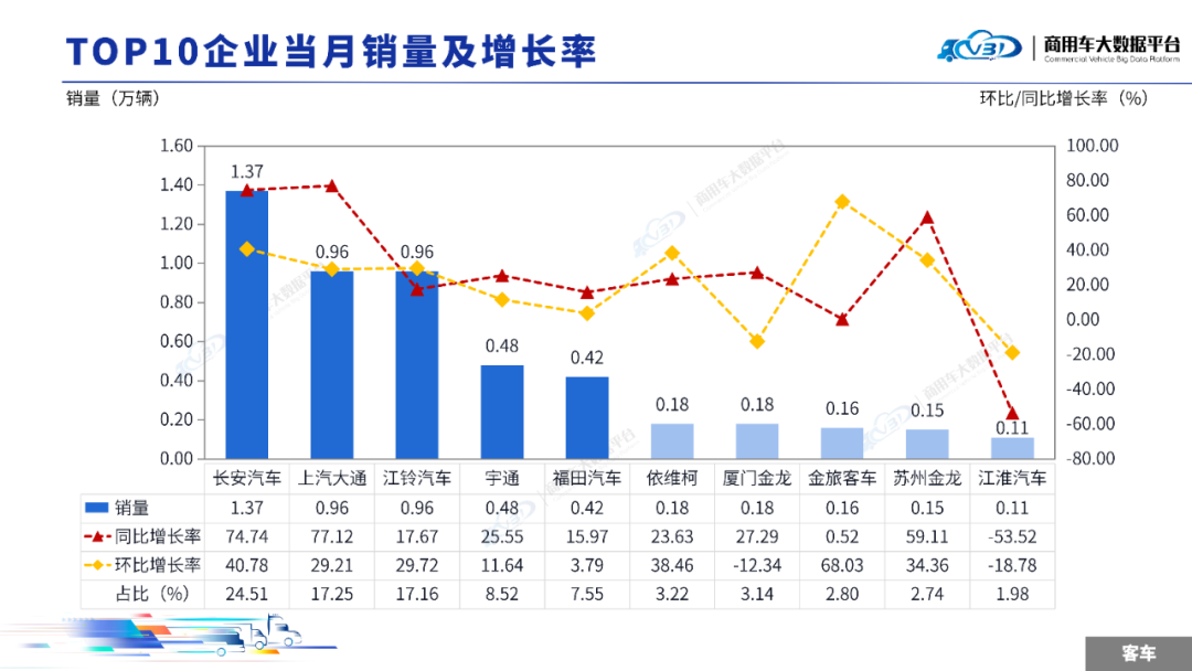 当月客车TOP5企业销量占比为75.00%,依次为长安汽车、上汽大通、江铃汽车、宇通、福田汽车。