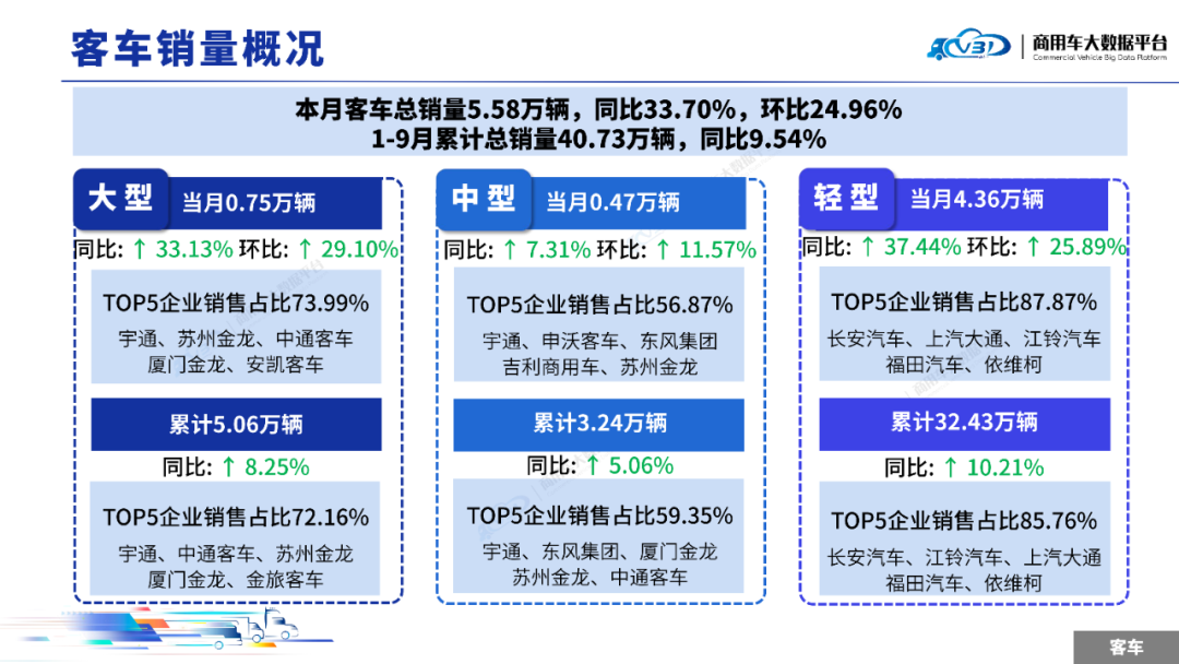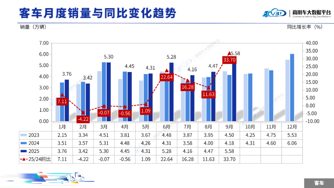 2025年9月客车销量(批发)为5.58万辆,同比增长33.70%,环比增长24.96%;1-9月客车累计销量(批发)40.73万辆,同比增长9.54%。