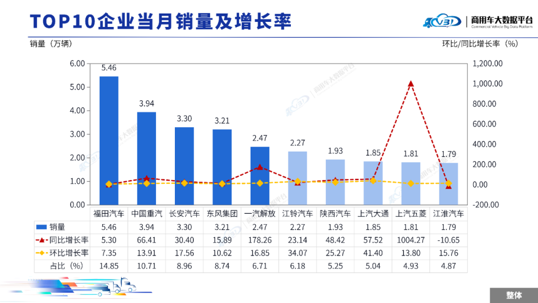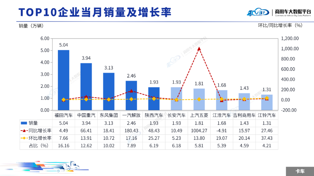 当月TOP5企业销量占比为49.97%,依次为福田汽车、中国重汽、长安汽车、东风集团、一汽解放。