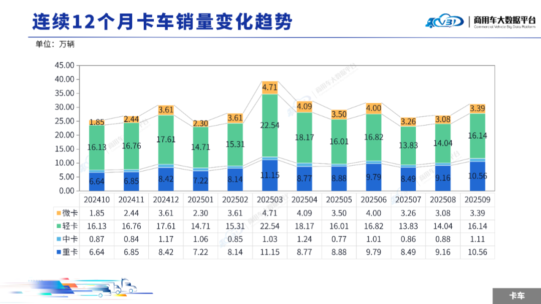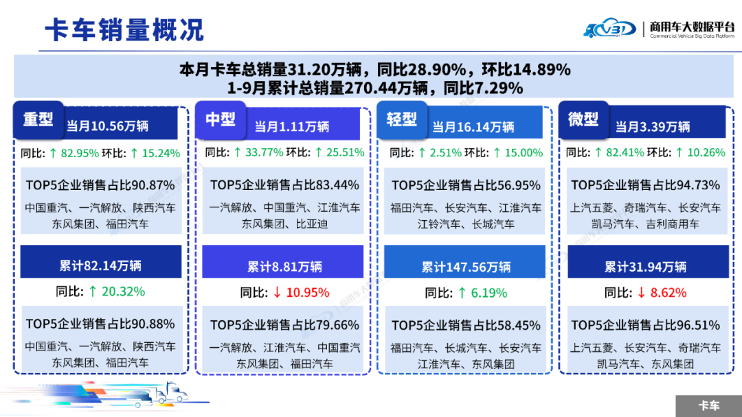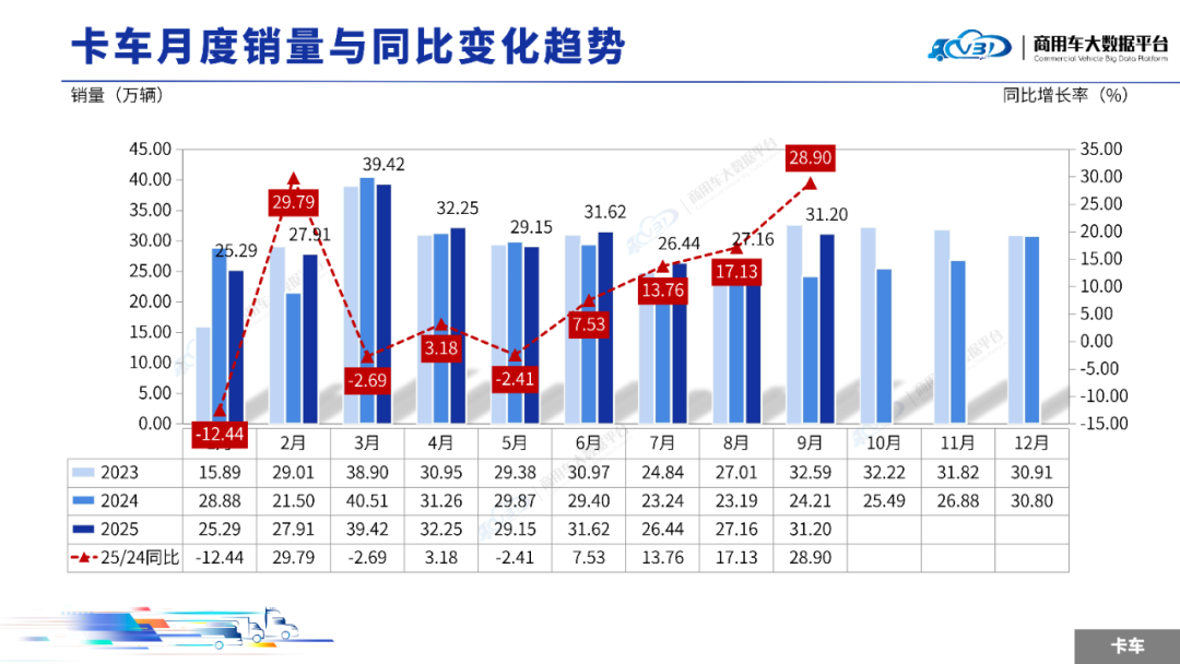 2025年9月卡车销量(批发)为31.20万辆,同比增长28.90%,环比增长14.89%;1-9月卡车累计销量(批发)270.44万辆,同比增长7.29%。