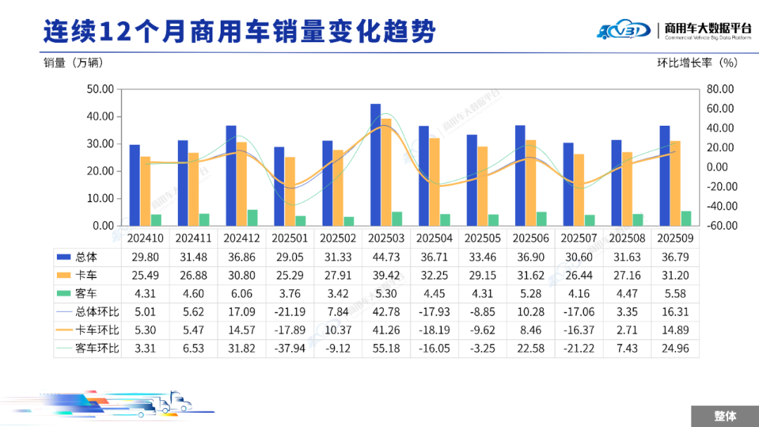 智通财经APP获悉,10月21日,中国汽车流通协会发布2025年9月全国商用车销量概况(批发)。数据显示,2025年9月全国商用车整体销量(批发)为36.79万辆,同比增长29.61%,环比增长16.31%。1-9月全国商用车累计整体销量(批发)为311.17万辆,累计同比增长7.58%。
