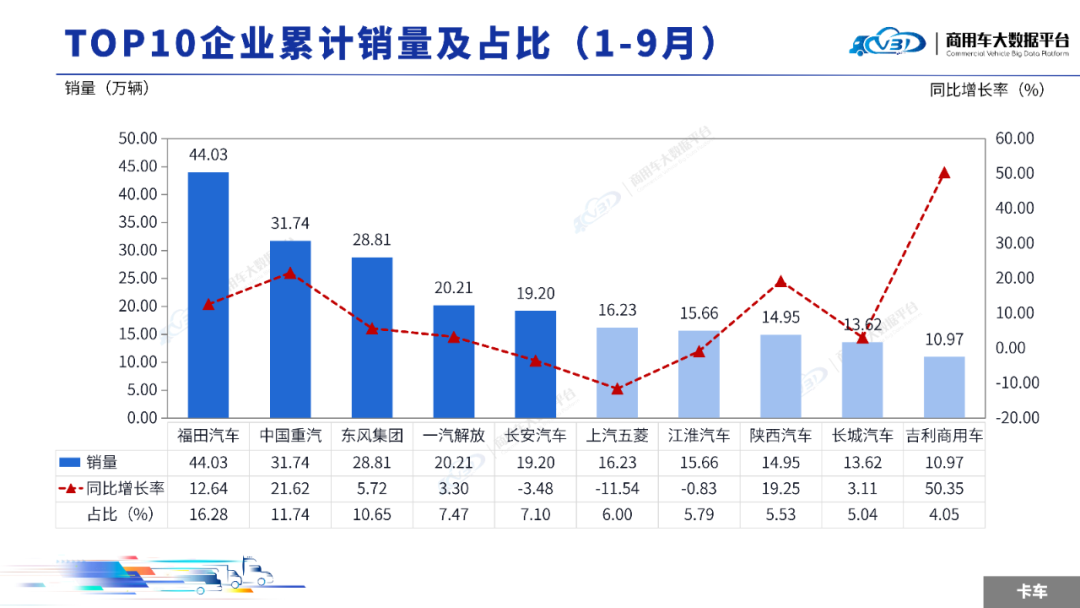 1-9月累计TOP5企业销量占比为50.68%,依次为福田汽车、中国重汽、东风集团、长安汽车、一汽解放。