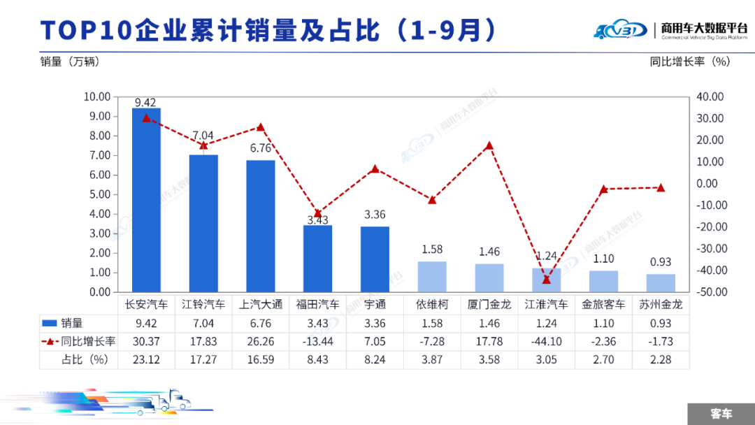 1-9月客车TOP5企业销量占比为73.66%,依次为长安汽车、江铃汽车、上汽大通、福田汽车、宇通。