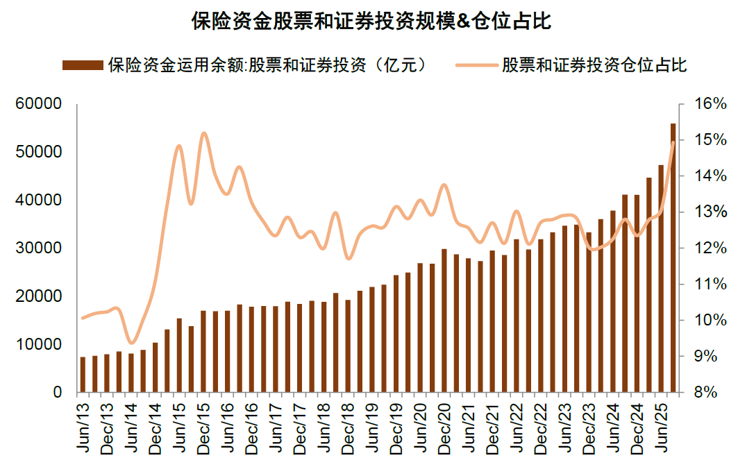 图表4:截至3Q25,险资持有股票及证券投资规模增长至5.6万亿元,仓位上升至14.9%