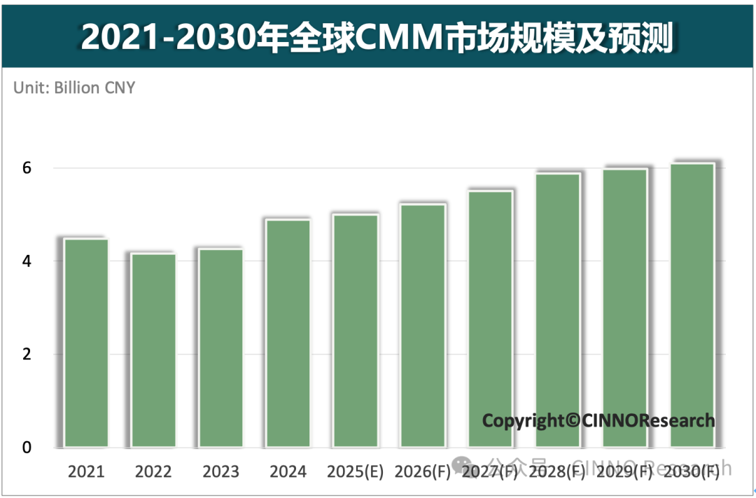 图示:2021-2030年全球CMM市场规模及预测,来源:CINNO Research