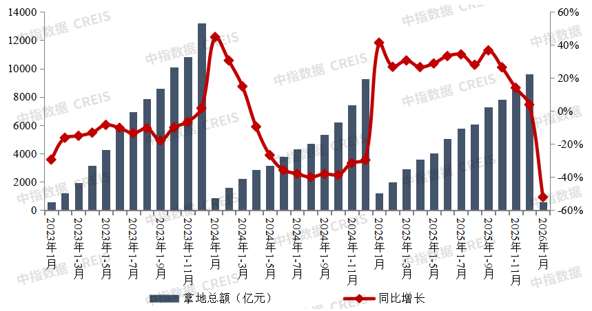 图:2023年-2026年1月TOP100房企累计拿地总额及同比