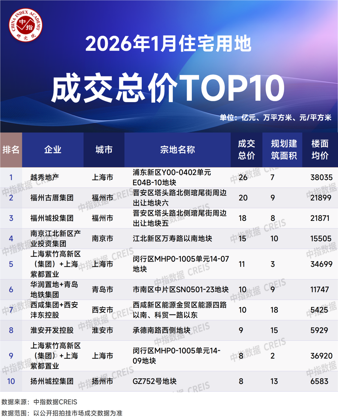 智通财经APP获悉,1月30日,中指研究院发布2026年1月全国房地产企业拿地TOP100排行榜。2026年1月,TOP100企业拿地总额579.9亿元,同比下降52.1%。房企开年拿地同比降幅较高,一方面是上年同期基数较高,2025年1月TOP100企业拿地总额同比增长四成多;另一方面,开年房地产市场仍存在不确定性,企业上年积极补仓的背景下拿地热度有所减弱,这也延续了上年四季度拿地热度走低态势。从拿地企业来看,央国企仍然是主力,拿地金额前十企业中多为地方国企,越秀地产、国贸地产、华润置地等大中型央国企拿地金额位居前列。