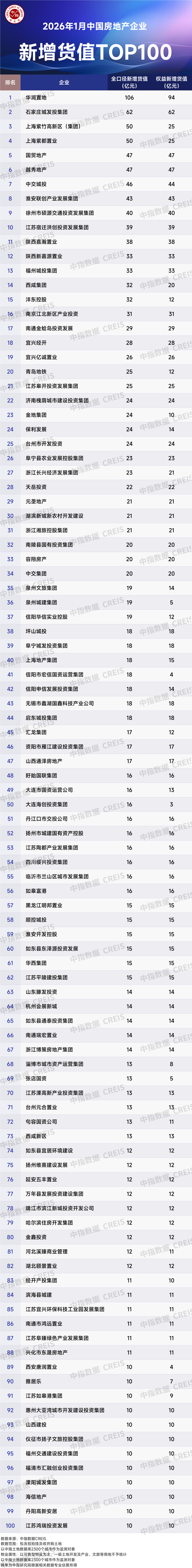 从新增货值来看,华润置地、石家庄城发投集团位列前二。2026年1月,华润置地以106亿元新增货值位列第一,石家庄城发投集团新增货值规模为62亿元,位列第二。TOP10企业2026年1月新增货值总额530亿元,占TOP100企业的25.7%,新增货值门槛为10亿元。