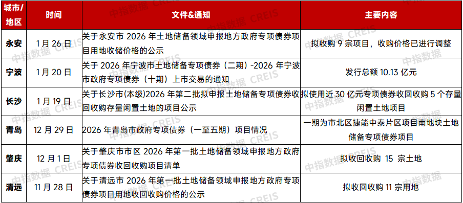 2026年专项债土地收储工作在多地陆续落地。1月19日,湖南长沙发布公告,拟使用近30亿元专项债券收回收购5个存量闲置土地项目。1月20日,2026年宁波市土地储备专项债券(二期)-2026年宁波市政府专项债券(十期)正式上市交易,本期债券发行总额10.13亿元。肇庆市自然资源局“关于肇庆市市区2026年第一批土地储备领域申报地方政府专项债券收回收购项目清单”显示,拟收回收购15块土地。此外,12月末,上海临港披露其控股子公司位于上海临港新片区的一宗住宅用地将被上海市土地储备中心收储,拟收储价格合计26.25亿元,较其成交价折价约4%,为上海首宗拟收储住宅地块。预计2026年更多城市将持续推动存量闲置地块收储工作,加快库存去化,更好的提振市场预期,改善房地产市场供求关系。