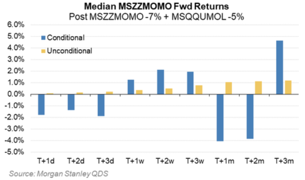 从历史统计看,摩根士丹利指出,当多空动量指数MSZZMOMO单日跌幅达到7%或以上,且伴随多头端弱势(MSQQUMOL当日跌幅5%或以上)时,这通常是随后几天的负面信号。从股价表现中位数来看,1-2个月的表现通常为负,第3个月转为正值。MSZZMOMO峰谷跌幅中位数约为22%。