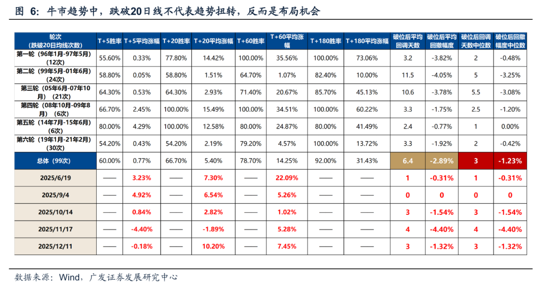 (1)过去6轮牛市中,阶段性跌破20日均线并不罕见,一共99次。