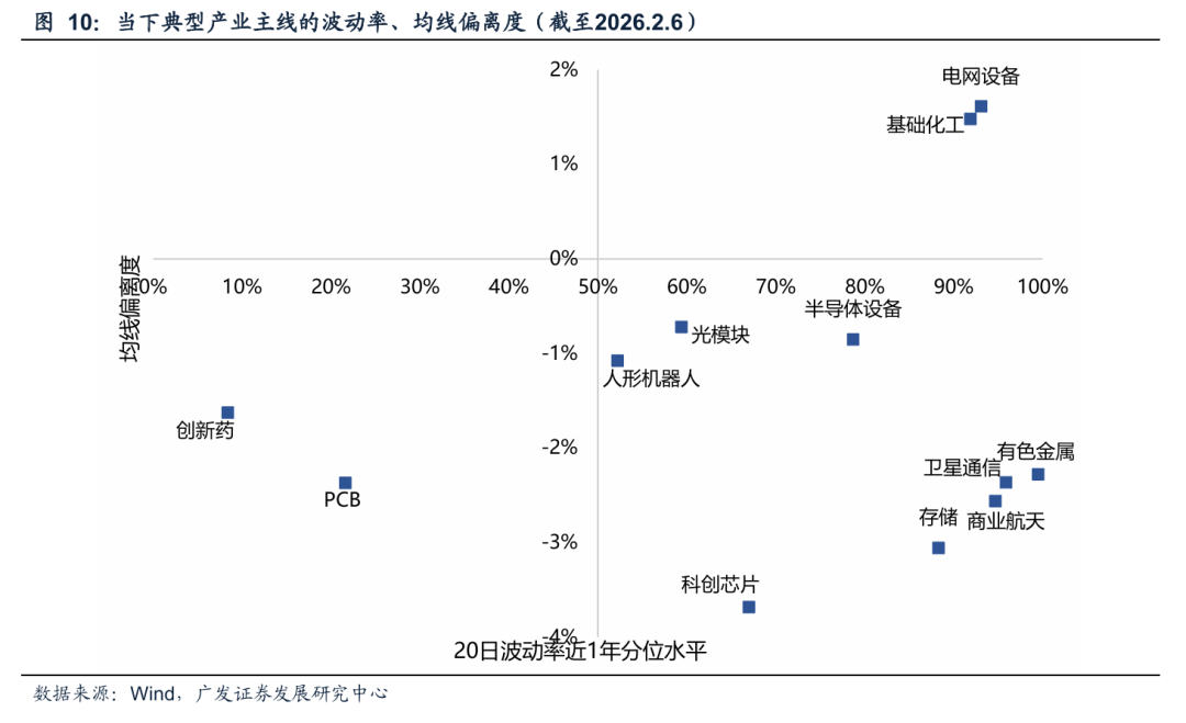 如果结合波动率来看,当下的典型主线中,①有色、卫星、存储、化工、电网等热门板块近期波动加剧,尽管从均线偏离度(赔率)的角度较为合适,但此刻入场的分歧较大,如果追求高胜率,仍需等待波动降低;②光模块、半导体设备、人形机器人、科创芯片则是最近一段时间趋势较强、赔率合适、波动适中的板块;③创新药、PCB等板块当下波动并不大,但其最近1个月的趋势并不强,更接近横盘震荡的走势。