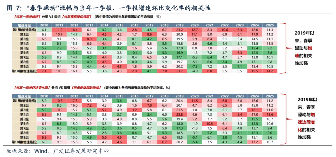 事实上,我们复盘下来,“春季躁动”与业绩的相关性很强,并非不看业绩,更不仅仅是“炒小炒差”。特别是2019年以来,“春季躁动”涨幅与当年一季报、一季报增速环比变化率的相关性逐步加强。