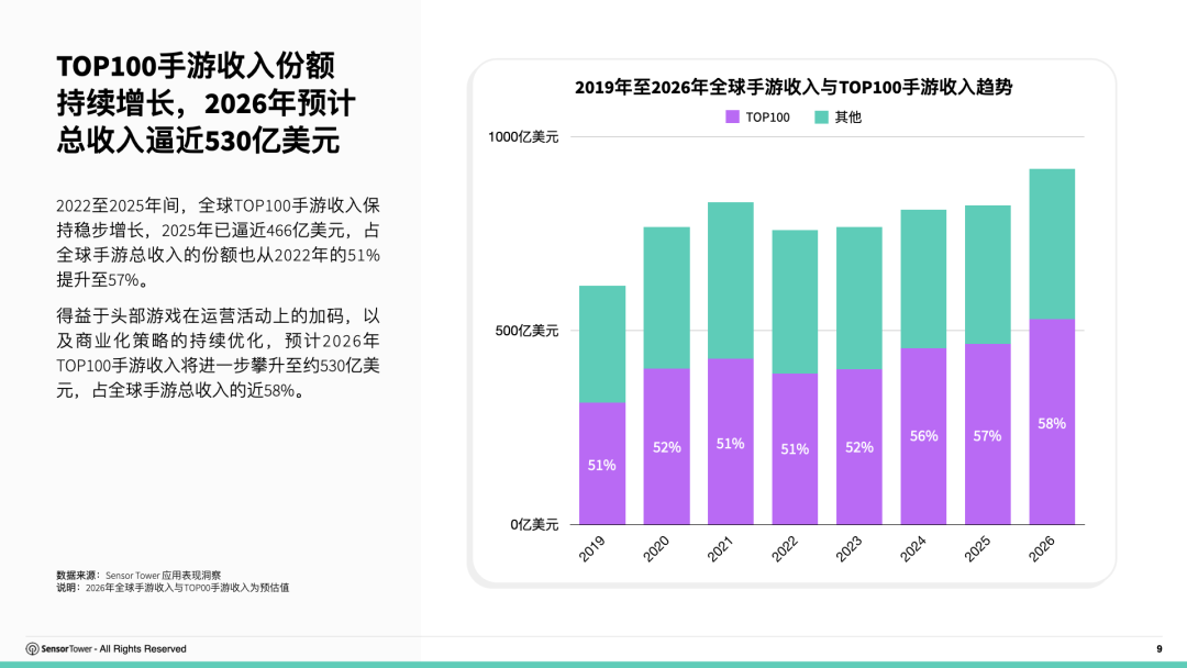 智通财经APP获悉,Sensor Tower发文称,2022至2025年间,全球TOP100手游收入保持稳步增长,2025年已逼近466亿美元,占全球手游总收入的份额也从2022年的51%提升至57%。得益于头部游戏在运营活动上的加码,以及商业化策略的持续优化,预计2026年TOP100手游收入将进一步攀升至约530亿美元,占全球手游总收入的近58%。
