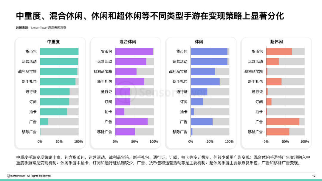 2025年中重度、混合休闲、休闲和超休闲等不同类型手游在变现策略上呈现显著分化趋势。