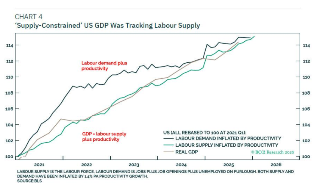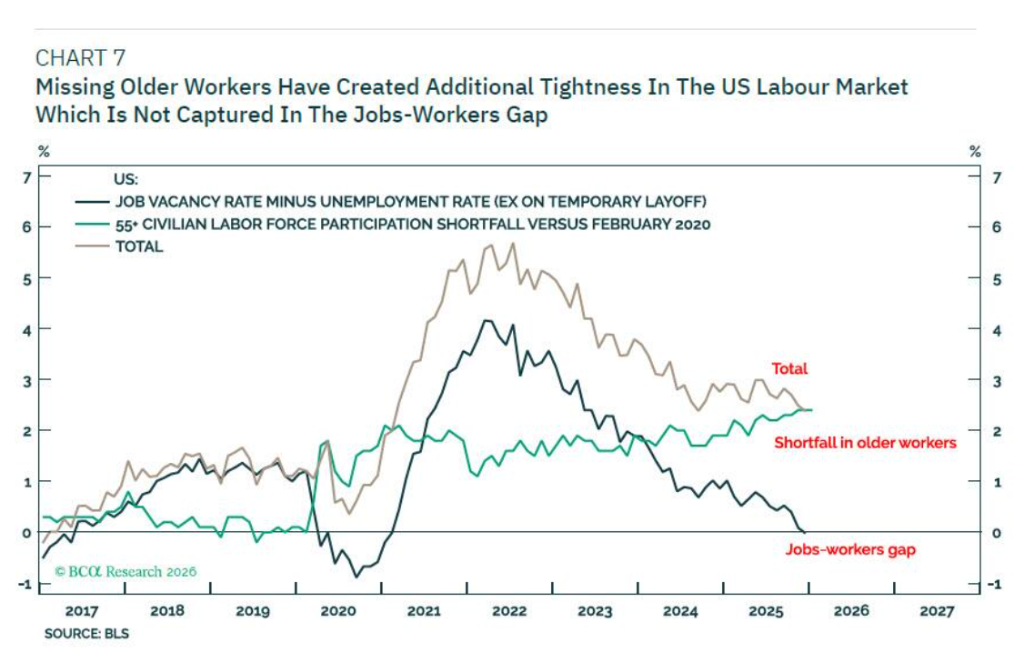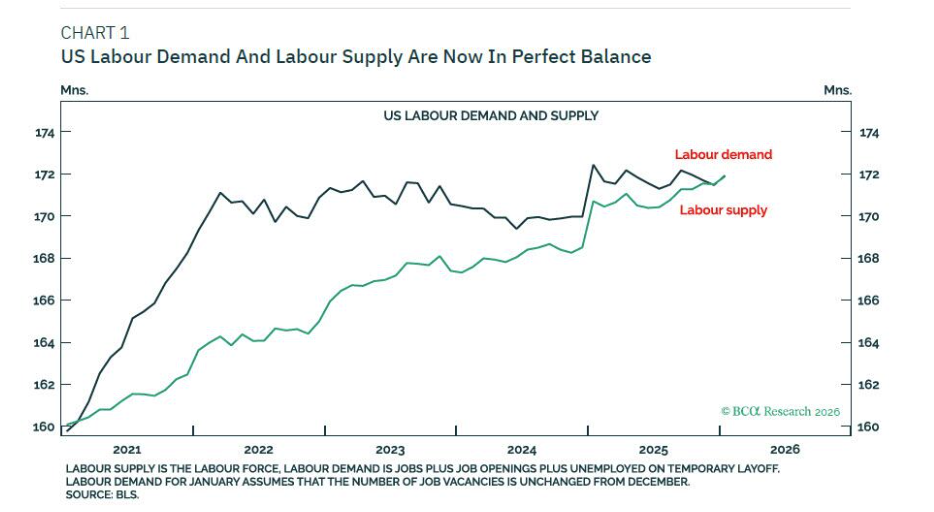 美联储的货币政策框架可能迎来重大转向。BCA Research分析师Dhaval Joshi预测,在未来美联储主席沃什的领导下,美联储或将事实上容忍通胀率升至2.5%至3.5%区间,以支撑美国经济在更高温度下运行。这一策略的核心动因在于美国劳动力市场已进入罕见的供需平衡点,任何一方的收缩都可能导致经济衰退。