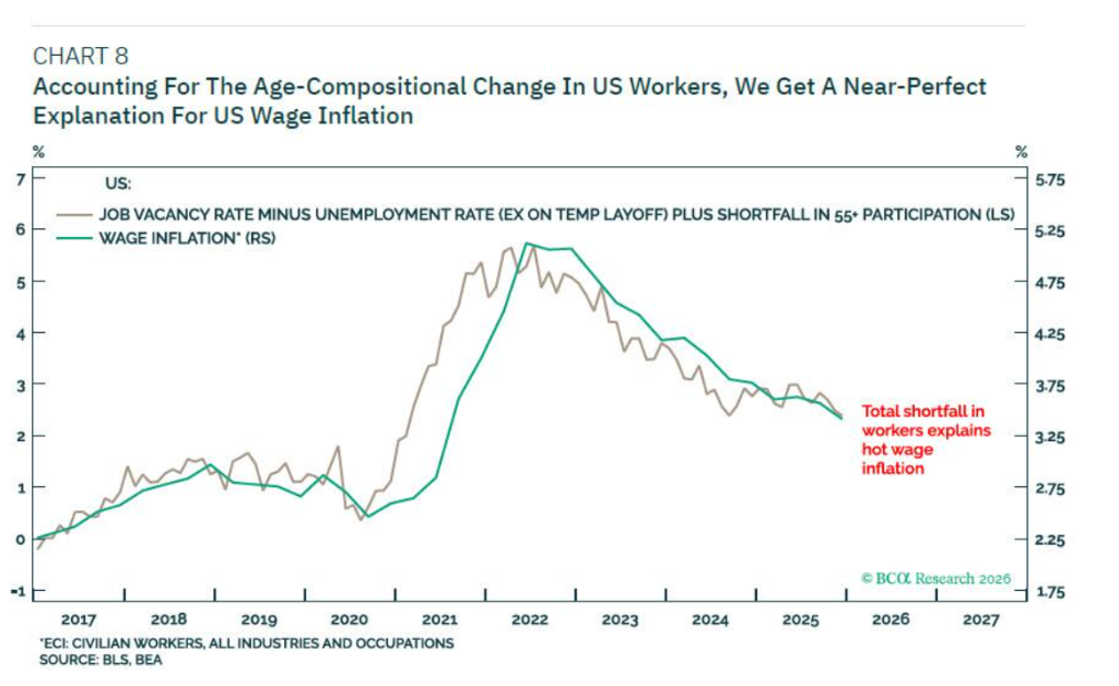 工资通胀结构性走高的深层原因,在于劳动力人口构成的持久性变化。相较于疫情前,美国劳动力供给减少了近300万年长工人。由于不同年龄段在劳动力市场上存在明显的功能互补性,年长工人难以从事体力密集型岗位,年轻工人亦无法替代需数十年经验积累的专业角色,年长工人的缺位在总体岗位缺口之外,创造了额外的结构性紧张。模型显示,将这一结构性因素纳入考量后,可以近乎完美地解释美国工资通胀的演变轨迹。