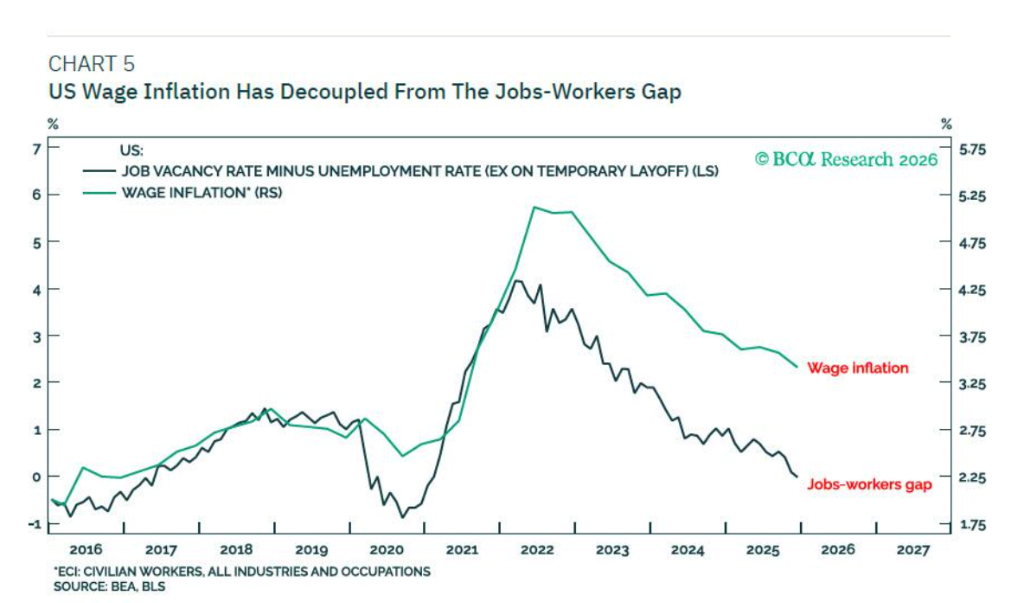 市场普遍寄望于人工智能技术能够推动生产率跃升,从而为更高水平的工资增长提供缓冲空间。然而,截至目前,上述缺口并未出现扩大趋势,这警示投资者不宜将AI驱动的生产率激增作为基准情景加以押注。