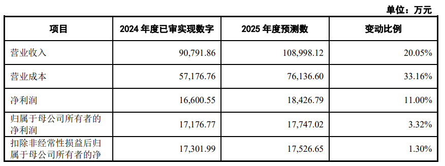 固德电材预测2025年度实现营业收入108,998.12万元,较上年增长20.05%;预测2025年度归属于母公司所有者的净利润为17,747.02万元,较上年增长3.32%;预测2025年度扣除非经常性损益后归属于母公司所有者的净利润为17,526.65万元,较上年增长1.30%。