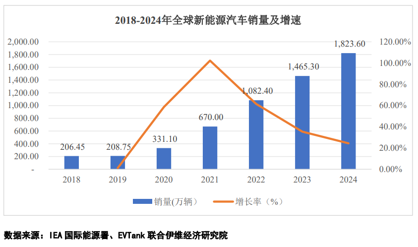 全球新能源汽车行业发展情况来看,根据IEA国际能源署、EVTank联合伊维经济研究院数据统计,2018~2024年全球新能源汽车销量复合增长率达43.78%,尤其是2021年以来全球新能源汽车销量呈爆发式增长,2024年全球新能源汽车销量达到1,823.60万辆,同比增长24.45%。