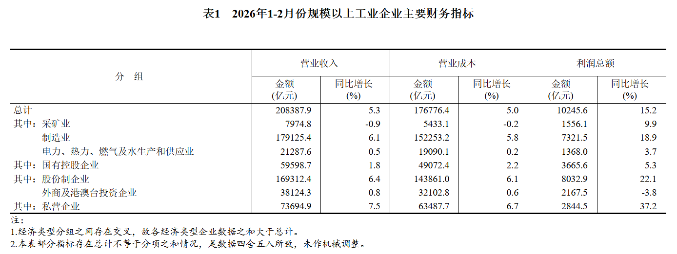 2026年1—2月份全国规模以上工业企业利润增长15.2%