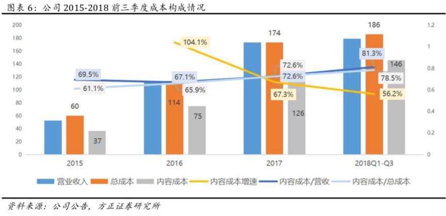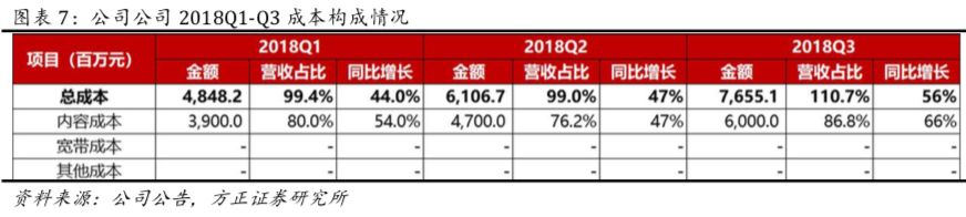 内容支出:18Q3内容成本为60亿元(YoY+66%,QoQ+28%),营收占比为87%。