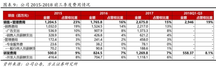 费用率:公司18Q3销售及管理费用为12.92亿元,费用率为18.7%,(YoY+3pct,QoQ+3.3pct),18Q3研发费用为5.58亿元,费用率为8.1%(YoY+1.2pct,QoQ+0.9pct)。