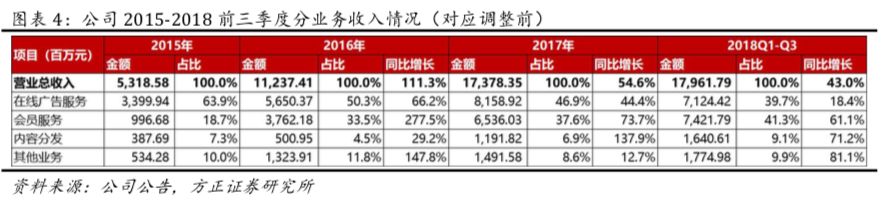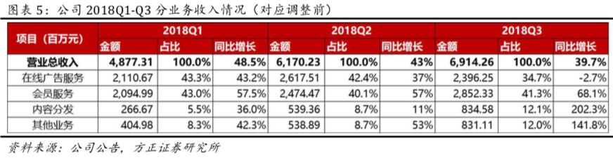 2、分业务收入:18Q3在线广告服务业务收入23.96亿元(YoY-3%,QoQ-8%),总收入占比34.7%(YoY-15.1pct,QoQ-7.8pct);会员服务业务收入28.52亿元(YoY+68%,QoQ+15%),总收入占比41.3%(YoY+7.0pct,QoQ+1.1pct);内容分发业务收入8.34亿元(YoY+202%,QoQ+55%),总收入占比12.1%(YoY+6.5pct,QoQ+3.3pct);其他业务收入8.31亿元(YoY+142%,QoQ+54%),总收入占比12.0%(YoY+5.1pct,QoQ+3.3pct)。