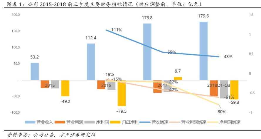 1、整体业绩:18Q3营收69.14亿元(调整后YoY+48%,QoQ+12%),营业利润-25.91亿元(YoY-143%,QoQ-95%),净利润-31.25亿元(YoY-197%,QoQ-49%),归属普通股净利润-31.40亿元(YoY+73%,QoQ-49%)。公司18Q1-Q3营收179.62亿元(YoY+43%),营业利润-49.82亿元(YoY-61%),净利润-56.17亿元(YoY-80%),归属普通股净利润-59.32亿元(YoY+61%)。