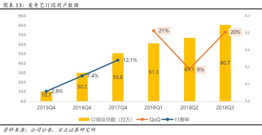3、受益于平台优质内容及多样化营销手段,18Q3爱奇艺订阅会员数达8070万(YoY+89%,QoQ+20%),DAU渗透率等用户指标持续领先。