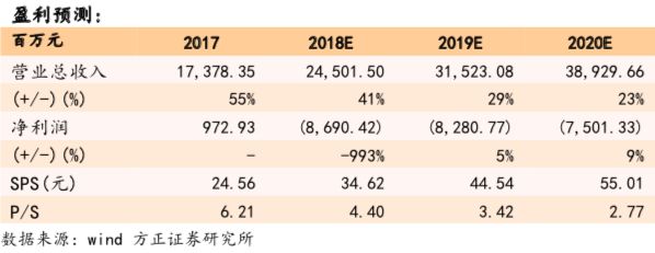 5、盈利预测与投资评级:我们预计公司FY2018-2020营收分别为245.02/315.23/389.30亿元,净利润分别为-86.90/-82.81/-75.01亿元,对应每ADS的SPS分别为34.62/44.54/55.01元,对应P/S为4.40/3.42/2.77X,维持“推荐”评级。