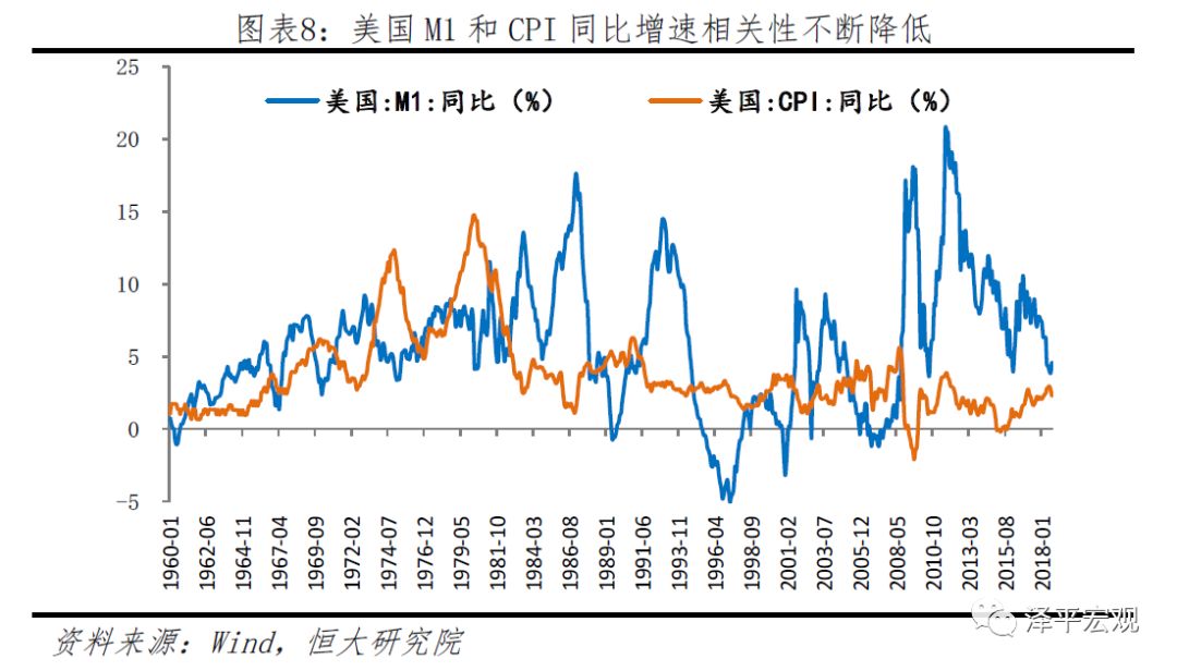 第一,20世纪末的货币失踪之谜。经济学家通过对货币需求模型估算出来的货币数量要大于实际中的货币余额。这正是因为实际中的货币余额未考虑流入到资本市场和衍生品市场中的货币数量,导致实际数量低于理论值。这也解释了美国20世纪90年代以来货币供给与通胀之间的背离,即货币供给增加并未影响通胀现象。虽然货币供给量M1有所增加,但是通胀指数CPI考察的是实体经济中的通胀数据,并不能考察到流入资本市场和衍生品市场导致的资产价格的波动。所以M1和CPI的方向出现了不一致。