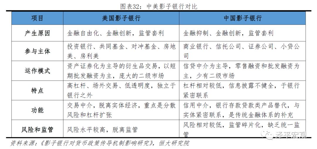 完善宏观审慎,在不打击支持实体经济的影子银行借贷的情况下守住影子银行膨胀带来的金融风险。中国的影子银行和美国的影子银行特征、运作模式、风险水平存在很大的差异。美国影子银行是1970年混业经营中发展起来的高杠杆操作、高风险操作、高期限错配、低透明度等模式,通过证券化衍生品获取资金,给金融稳定和经济发展带来了巨大负面影响。中国是信贷主导的中介模式获取监管套利,是传统金融的补充,并不涉及复杂的金融衍生品。风险点在于产品设计的不合理带来的流动性风险、期限错配风险和收益错配风险,以及参与主体中的过剩产业、房地产产业、地方融资平台等顺周期行业所带来的信用风险。不可否认,其发展客观上缓解了金融系统长期存在的中小微企业融资难、融资贵问题,完善了信贷市场发展,美国影子银行最初发展也对美国经济发展起来了重要而积极的正面作用。在守住金融系统风险时,客观看待,切不可“一刀切”的全盘否定,需加强监管和制度约束,引导影子银行向合规、健康、可持续的方向发展。