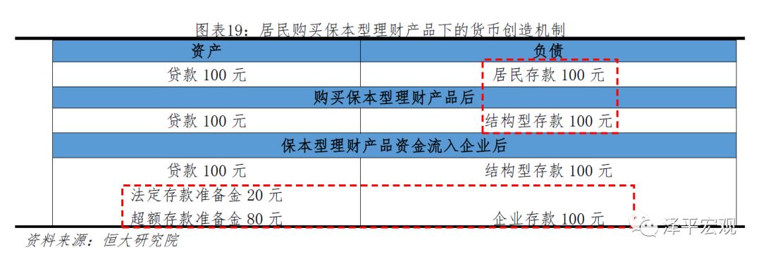 假如居民用本来存放在银行的存款购买了商业银行A的保本型理财产品,则居民的储蓄存款变成结构性存款,并没有改变货币供给。但当理财产品最终转化为企业存款时,银行资产端会增加相同金额的企业存款,从而资产负债表扩张,货币创造。若居民用存款购买了商业银行A的非保本型理财产品。则商业银行A负债端居民的存款将出表,资产端相对应的资产也将出表。考虑到理财产品最终会转变为企业的存贷款,所以最终商业银行A负债端由原来的居民存款转变为企业存款,资产端是相同金额的资产项目,货币供给并未增加。