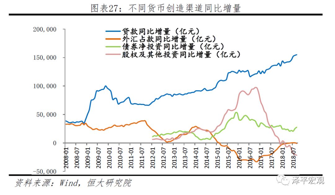 2017年4月之后,购买债券成为货币创造的第二大渠道,目前处于稳定增长阶段。货币供给新常态的一大变化就是债券净投资增速保持增长,成为第二大货币创造渠道。