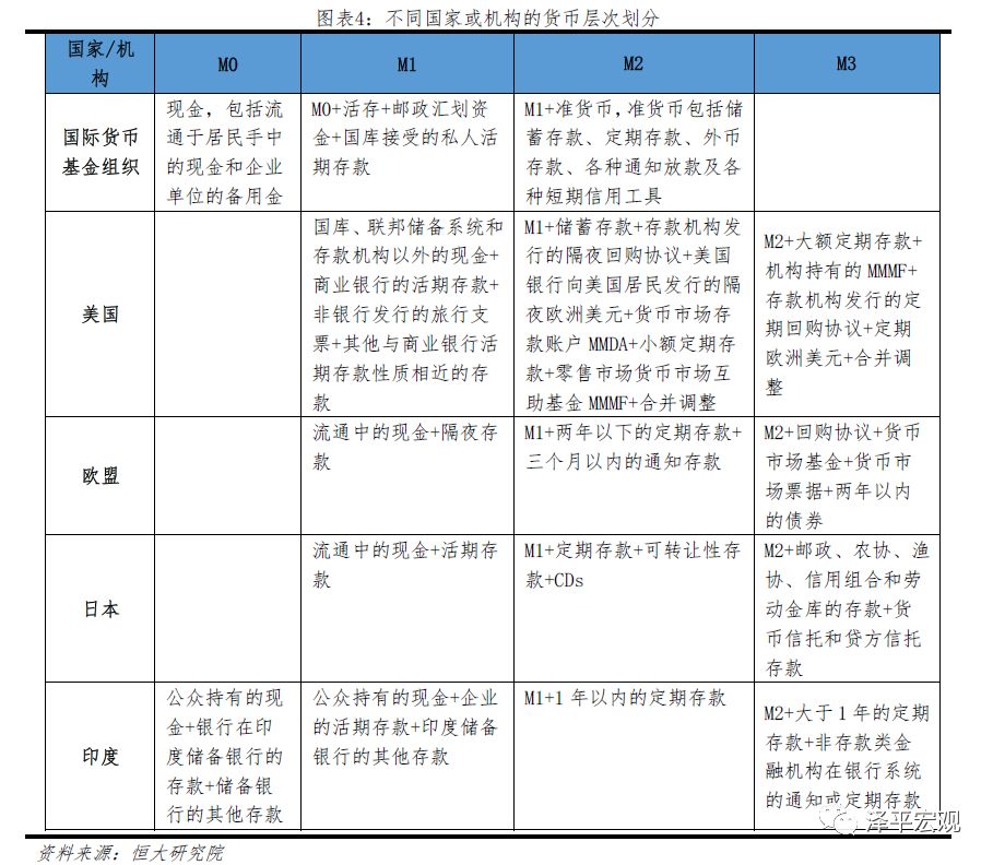 一般来说,西方经济学家根据货币的变现能力将货币分为以下5个层次。M0=现金;M1=现金+活期存款;M2=M1+储蓄存款+定期存款;M3=M2+非银行金融机构的存款;M4=M3+金融机构外的短期金融工具。但是各国有各自的划分标准,不同时期的货币层次划分也可能不相同,基本思路都是按照货币的流动性进行划分。(详见报告《货币层次剖析,解读M1、M2》)