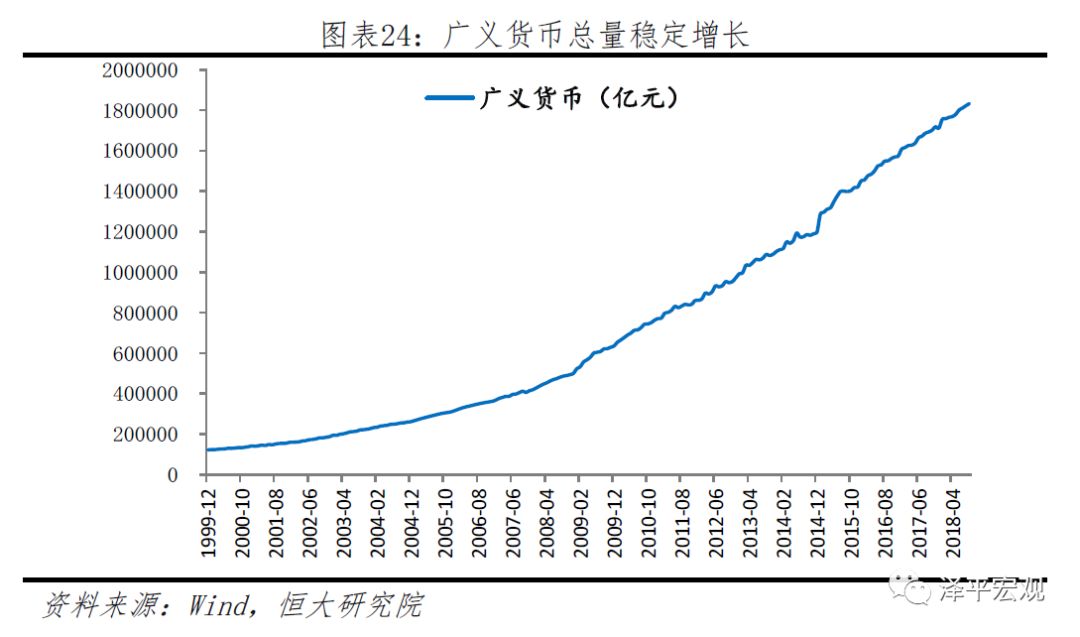货币创造公式左边:从存量上来看,广义货币稳定增长。除了2014年、2015年广义货币稍微波折,2009年快速增长,其他年份包括08年金融危机广义货币总量金额较为稳定增长。