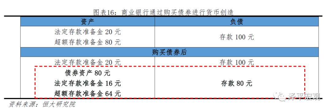 3)随着金融市场的发展,银行通过购买非银行类公司债券贷款进行货币创造比重也越来越大(注意:如果银行购买的是银行债券,只会银行间超额准备金的转移,并不会增加存款从而货币创造)。和发放贷款与购买外汇类似,银行购买债券80元,资产端的超额准备金转化为债券资产。由于同时客户增加了80元存款,从而负债端存款总额为180元,资产端债券资产80元、法定准备金36元、超额准备金64元。银行每次购买债券都会派生存款,从而货币创造。