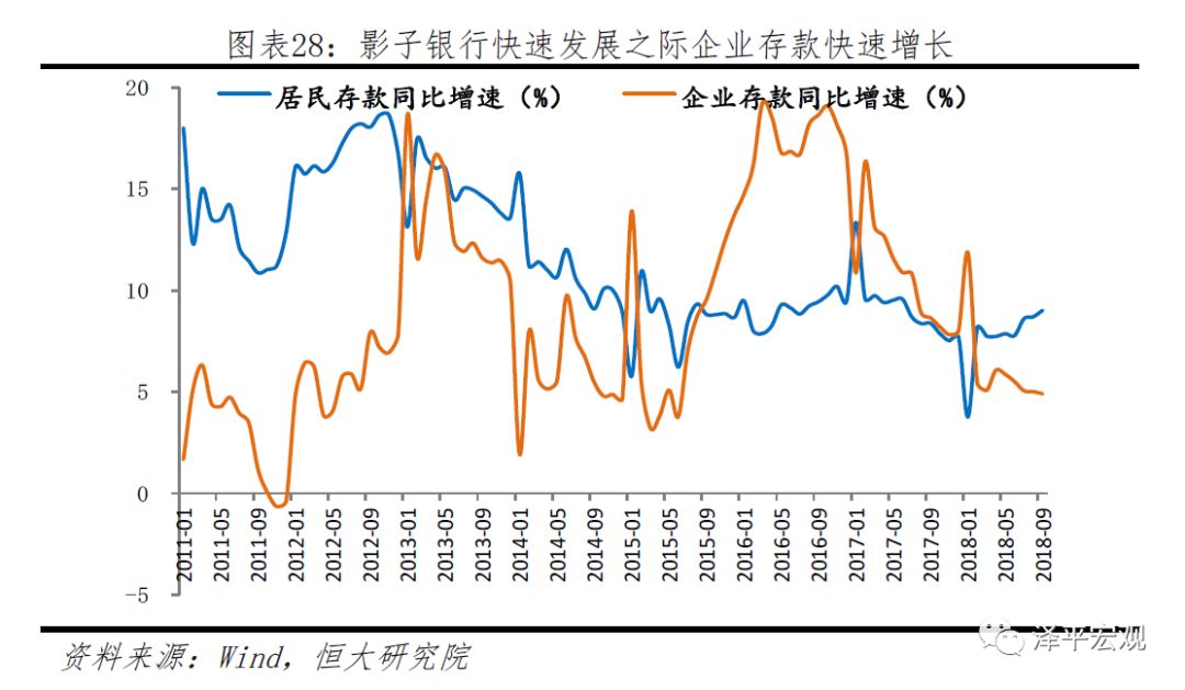 从增量来看,股权净投资增量在趋近贷款增量之后,快速下滑到负值。在2014年之前股权及其他投资同比增量稳定增长。后随着同业链条、通道链条的快速发展,股权及其他投资同比增量快速发展。2015年成为第二大货币供给增量渠道。到2016年10月,增长到9.7万亿元,接近贷款同比增量的12万亿元。后随着金融去杠杆、资管新规等严监管,快速下滑到负增长,成为拖累货币供给增长的一大渠道。企业存款同比增速的变化也反应这一现象,在影子银行快速发展之际,企业存款快速增长,严监管之下,快速回落。2018年之后,随着企业存款增速大幅跳水、居民存款增速相对有所回升。