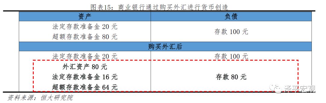 2)随着外汇的不断流入,银行通过购买外汇进行货币创造的方式也得到重视。在上表的基础上,银行不是发放贷款而是购买外汇,80元超额准备金变成银行的外汇资产。同样的,客户增加80元存款,银行增加16元法定准备金、64元超额准备金。然后银行可以继续用超额准备金购买外汇。银行每次购买外汇都会创造存款,从而货币创造。