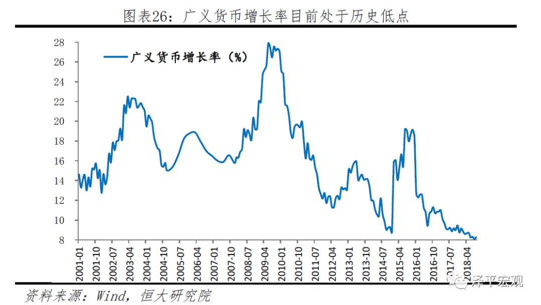 货币创造公式左边:伴随着经济下滑的需求压力和严监管的供给收缩,货币创造能力下滑,广义货币增长率目前处于历史低点。广义货币增长率波动较大,总体在8%至28%之间波动。2008年金融危机,在“四万亿”的刺激下,货币增长率一度达到27.87%,后随着经济增速换挡GDP增速下滑,融资需求下降,货币增长率也随之下滑。2016年随着监管的趋严,货币创造能力进一步下降,货币增长率在2018年8月达到历史低点8.08%。