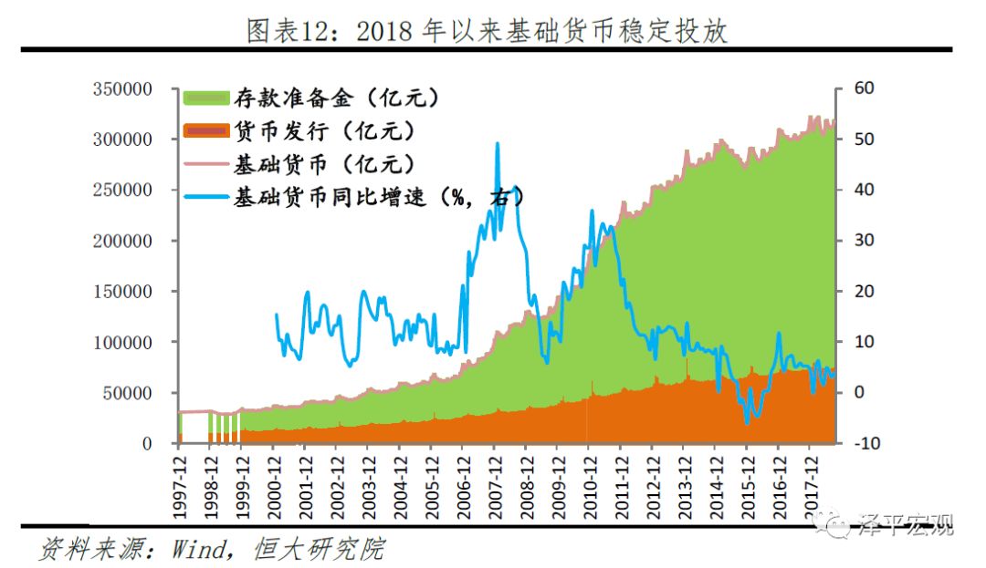 公式左边反映基础货币投放量的变化:在经过2006-2013年快速增长之后,央行基础货币投放目前处于历史较低增长率水平,甚至有下滑的趋势,显示目前央行货币政策还是较紧的。截至2018年9月,基础货币投放31.79万亿元,其中货币发行规模7.81万亿元、存款准备金23.98万亿元。从规模来看,自中国加入WTO以后,基础货币同比增速波动较大,最高达到49.19%。后随着外汇占款的趋稳,基础货币投放增长率明显下行,2016年、2017年、2018年同比增速分别为1.29%、5.61%、3.51%。从占比来看,存款准备金是基础货币主要组成部分。2011年以后,存款准备金基本稳定占比75%。