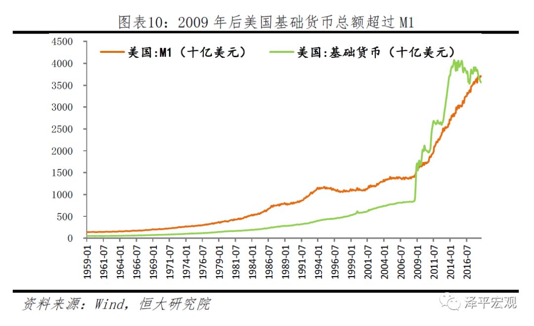 第三,2008年后的货币政策失灵。美国在2009年至2011年的“宽货币”未导致“宽信用”的现象。金融危机之后,美国希望通过美联储扩大货币流动性投放基础货币来注资商业银行,通过商业银行的货币创造来增加市场流动性以逆周期刺激经济增长。但在实际操作中,货币创造过程堵塞,货币传导机制不畅,货币倒流,货币政策有效性降低,货币政策失灵。具体表现是一直低于M1金额的基础货币,在2009年之后,居然金额一直反超。一部分原因就是存款不是实体经济和个人财富的唯一形式,财富还可以投资于资本市场和衍生品市场,创造流动性。这也是目前中国货币政策面临的一大问题。