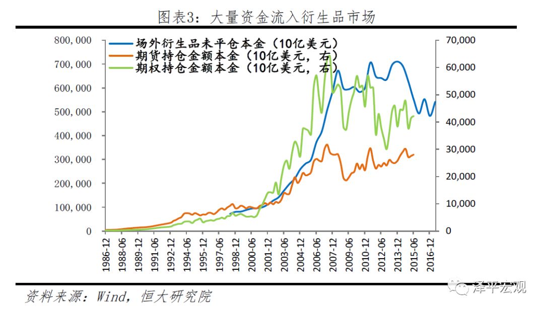 第三阶段:20世纪70年代后,伴随着金融自由化的思想浪潮,货币研究拓展到衍生品市场,研究金融创新对货币数量的影响。70年代,布雷顿森林体系崩溃,浮动汇率取代固定汇率。为了对冲汇率波动的风险,1972年,世界第一份金融衍生品合约-外汇期货产生。随着金融市场的不断发展,金融工具的不断创新,衍生品种类不断丰富,交易金额不断创新高,资金不断流入资本市场和衍生品市场。理论上,同年代的麦金龙和肖提出金融深入论,认为政府应放弃对金融市场和体系的过分干预,放松对利率和汇率的控制。所以,在浮动汇率下,受益于金融自由化的洗礼,各国对可以规避风险、套期保值的衍生品越发重视。