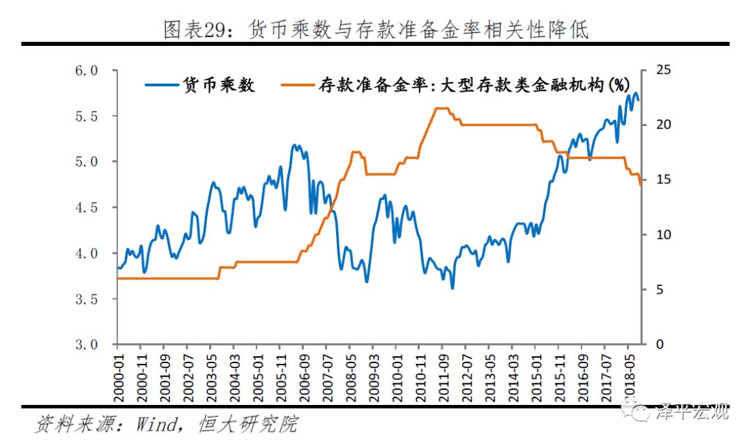 第一,随着金融创新,货币创造渠道通过货币乘数改变了货币供给,增加了央行调整法定存款准备金率来改变货币乘数从而改变货币供给的难度。总体来看,存款准备金率从2000年的6%增加到2018年9月的15.5%,货币乘数不降反升,从3.84增加到5.67。随着影子银行的快速发展,带动了金融产品的不断创新,由于金融产品的收益率比存款、现金要高,居民持有通货的意愿降低、银行超额准备金率降低,货币乘数变大。在影子银行快速发展的2011年,虽然存款准备金率并未调整,但是货币乘数仍然在上升。