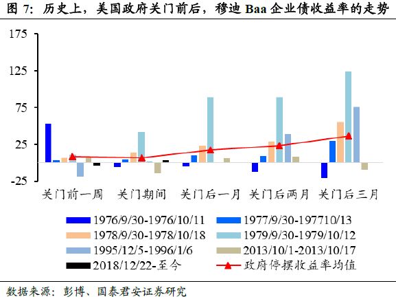但是美政府关门或是“短期内美债收益率将攀升,即债市下跌”的信号。从历史来看,在超过10天的6次关门中,关门期间及开门后3个月左右甚至更长时间,10年期美国债收益率普遍上涨,期限利差走阔(图6)。公司债收益率也随着国债水涨船高(图7)。究其原因,美政府关门意味着:民主、共和两党在短期内难以就预算问题迅速妥协,反映了美国政府财政存在一定问题,市场自然对美国债投资趋于谨慎。例如,2019年1月8日,美财政部拍卖3年期美国国债,得标利率高于同期限的美债收益率,投标倍数创2009年以来最低。