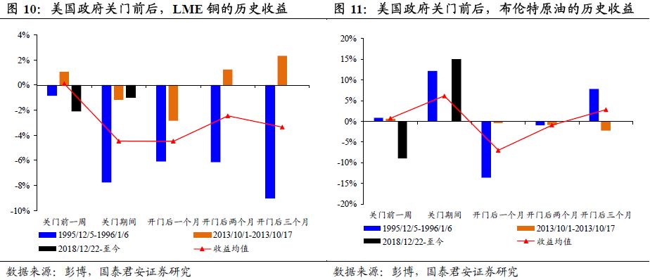 美国政府关门,对大宗商品整体影响有限,历史上并不存在固定规律。(1)在超过10天的6次关门中,关门期间大宗指数3次上涨、3次下跌;在开门后的一个月与两个月也均为3次上涨、3次下跌。(2)大宗指数在95年12月5日-96年1月6日以及关门期间,分别录得9.25%与0.4%的正收益,而在开门后1个月与2个月内明显转负。(3)从6次关门的平均收益看,关门前一周为0.47%,关门期间1.82%,开门后1个月-0.78%,开门后3个月2.33%(图8)。以上特征反映:美国政府关门可能并非影响大宗商品的重要因素。