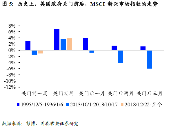 美股波动率在美政府关门期间或走高,但随后回落。理论上分析,美国政府关门至重启是短期内美国政治分歧走向一致的过程,对应风险变化先扩散后收敛。从历史看,具有如下特征:(1)美国政府关门前后,市场波动率总体先升后降(图4)。在超过10天的6次关门中,波动率从关门前一周的平均10.26%,攀升至开门后一个月平均12.61%,然后趋于回落。(2)市场波动率的顶部大多处于关门期间或开门后一个月,这可能取决于市场对未来风险的判断。在2013/10/01-2013/10/17年的政府关门中,美股波动率在关门期间达到17%,开门后一个月回落至13.10%。而1976年、1978年波动率峰值出现于开门后的一个月。如果本轮政府关门继续延长且美国政治分歧难以缓和,短期内不排除市场波动率继续攀升。