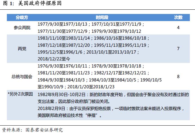 历史上,自1976年以来,美国政府由于各种争议导致政府停摆。在福特和卡特总统任期内,美国一共出现了6次政府部分停摆,受影响的部门为美国劳工部与卫生、教育及福利部,这6次政府部分停摆持续时间从8-18天不等,政府关门的主要原因是对人流医疗补助的争议。里根当政期间,美国一共出现了8次持续1-3天的政府完全停摆,主要争议是关于政府开支。老布什治下也由于政府赤字问题出现持续4天的政府完全停摆。克林顿当政时期,美国政府在共和党取得控制权后遭受2次分别持续5天和21天的完全停摆,仍然是由于赤字问题。2018年,特朗普任期内出现3次政府停摆,均围绕预算法案展开。美国政府停摆时间超过一周共计10次,超过两周的共计4次(图1)。