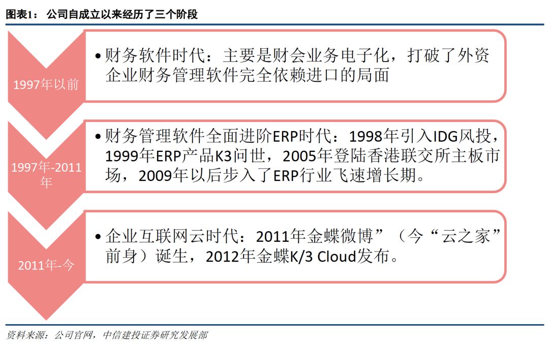公司成立于1993年,公司自成立以来主要经历了三个阶段发展历程:1)1997年以前的财务管理软件阶段;2)1997年至2011年的ERP产业转型阶段;3)2011年至今的企业软件云转型阶段。虽然历程不同,但是目标一直是为企业管理信息化提供服务,目前公司员工数量超过8000人,服务客户数670多万,连续14年稳居成长型企业应用软件市场占有率第一、更连续2年在企业级SaaS云服务市场占有率排名第一。